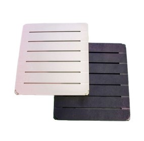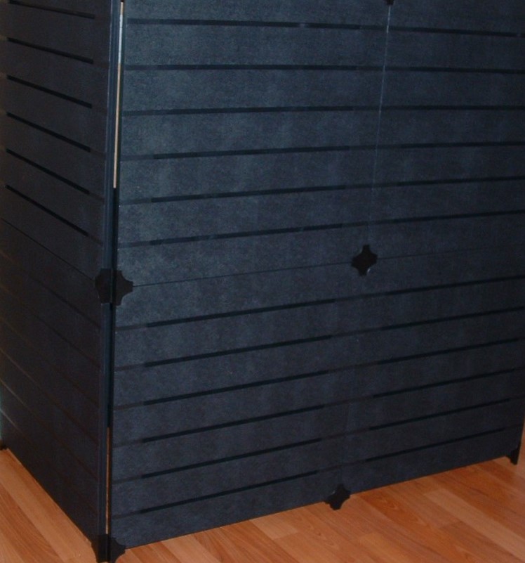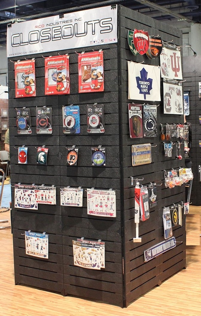 Large Slatwall Panel Towers: Available for purchase or rent. This slatwall design features a quantity of four 4′ x 4′ x 8’H triangle slatwall towers. Total of over 375 square feet of surface space. The towers can be placed where you’d like. Towers can be rented individually and in a variety of shapes (triangle, square, rectangles) and 6’H or 8’H. Colors: Black or Ivory. Custom printed panels and laminated surfaces also available. We also provide graphic design and print services.