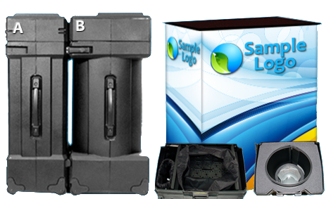 The 4200A rotomolded, wheeled, case will accommodate a standard 10′ pop-up frame and lights. The 4200A Interlocks with it’s “twin” the 4200B case, which holds a full set of graphics or fabric panels. The two cases can be separated for transport and joined together to form a podium at the show . Fabric and graphic case-to-podium conversion kits are available.