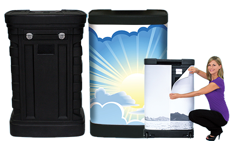 This roto-molded exhibit transit case is the perfect, premium protective shipping case for a variety of exhibits, displays, and more. The OCP2 has built-in recessed wheels to help protect during transit. It also features premium zinc plated steel locks to ensure display material is secure during transport. Add a professional finish to your display by converting the OCP2 case into a counter with a roll wrap for an exposed countertop or a pullover fabric stretch wrap for a completely covered exterior.